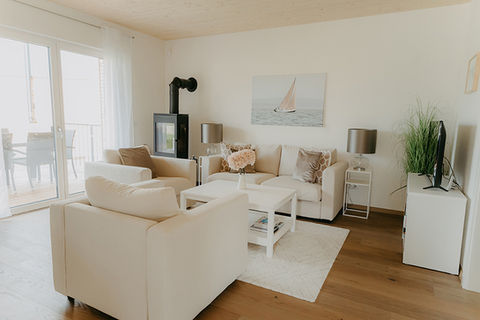 Außerdem gibt es natürlich einen Essbereich für 5 Personen sowie einen gemütlichen Sitzbereich Sofa, Sessel und großem Smart-TV mit Streaming-Optionen und einen kleinen Schwedenofen. Hier können Sie in den Hebst- und Wintermonaten die wohlige Wärme des Ofens genießen.
